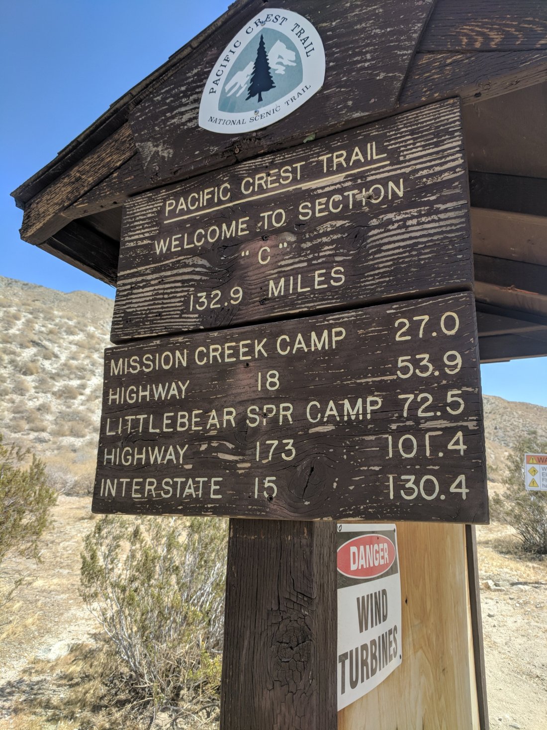 I was back on the trail by 10:30 and soon decided to take a break at the Mesa Wind Farm for a bit over an hour. They have a shady spot and ice cold water for us since it’s about another 7miles until the next water.