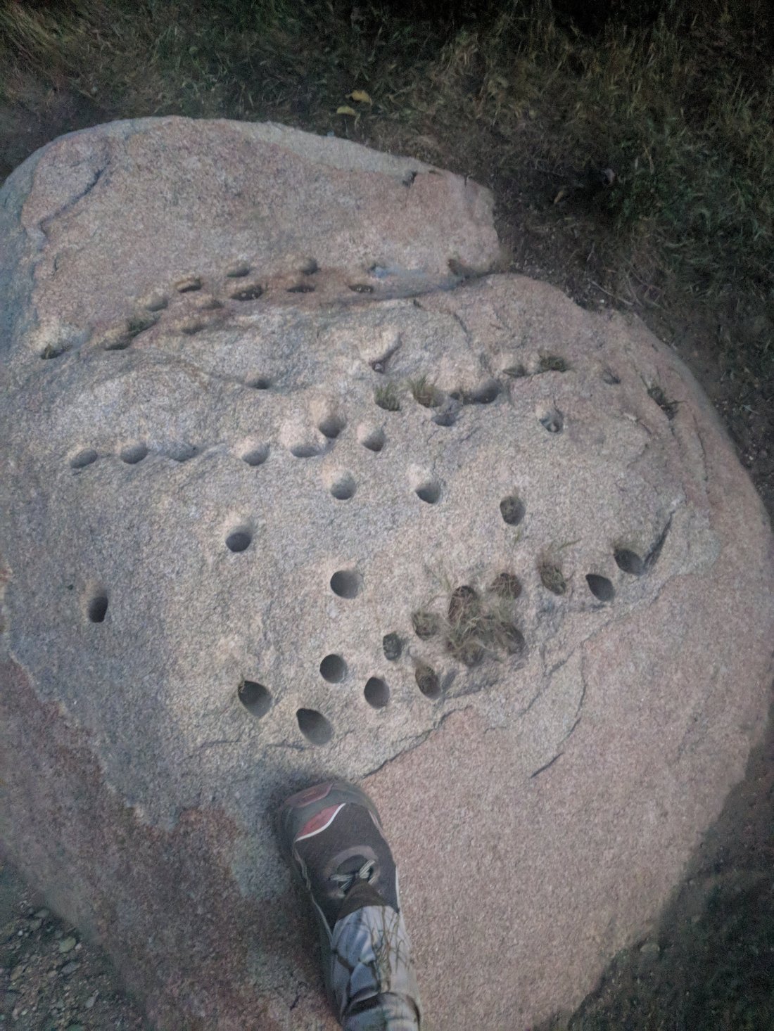 These are drilled holes in a rock next to the trail. I call this “Trail Builder Frustration” or some sort of reverse brail message, chess maybe? Whoever did this is laughing at me now.