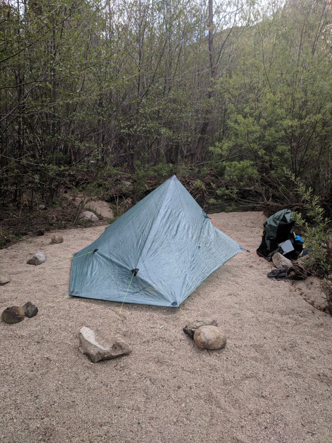 I’m finding some inadequacy with my tent selection. Although I love the 17oz weight (Zpacks Hexamid Plus) the size isn’t fitting me well when using my Neoair mattress. My quilt touches one end and my forehead is about 2-3″ from touching the other. Last night I anticipated condensation so I placed a barbage bag over my feet, just enough to keep my bag from contacting the tent. It worked ok but backfired, it still had condensation inside the garbage bag!! Ugg…. Note that single wall tents are more prone to condensation so I did anticipate it but it’s annoying.