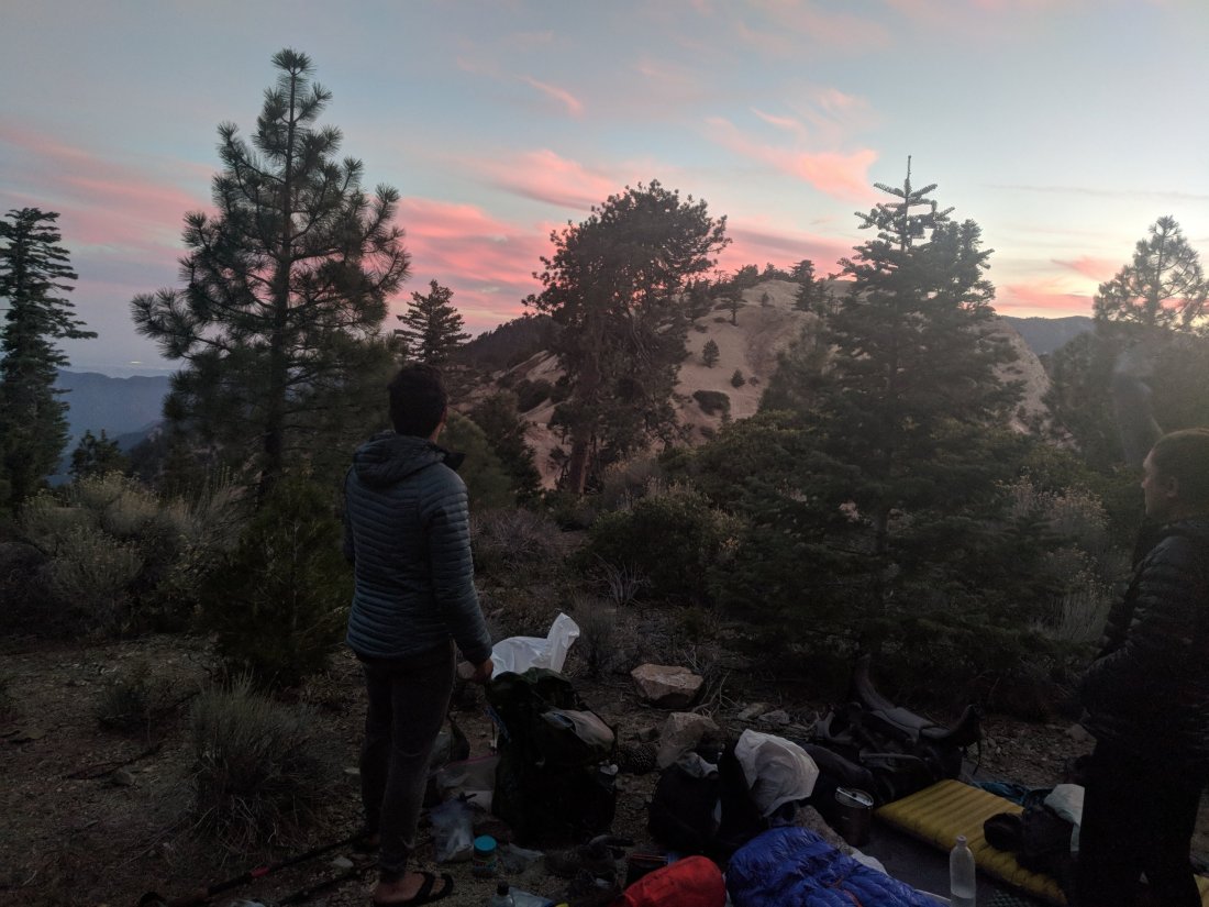 Once the sun had set we were all tucked in by 8:00ish, the normal hiker bedtime. In my quilt watching the sky stars slowly begin to show themselves. To me I imagine each is a needle prick from someone on the other side of the sky. A jet paints a contrail across the canvus. The lights of Los Angeles at our feet. The trees black silloette above me swaying from the breeze. The first satellite floats evenly across the sky. The Big Dipper appears perfectly centered between the trees above me. We are all lined up in our cacoons. Flipper on the end to my right still journalling by headlamp, penguin, Snack, Me and Froggy to my left.
