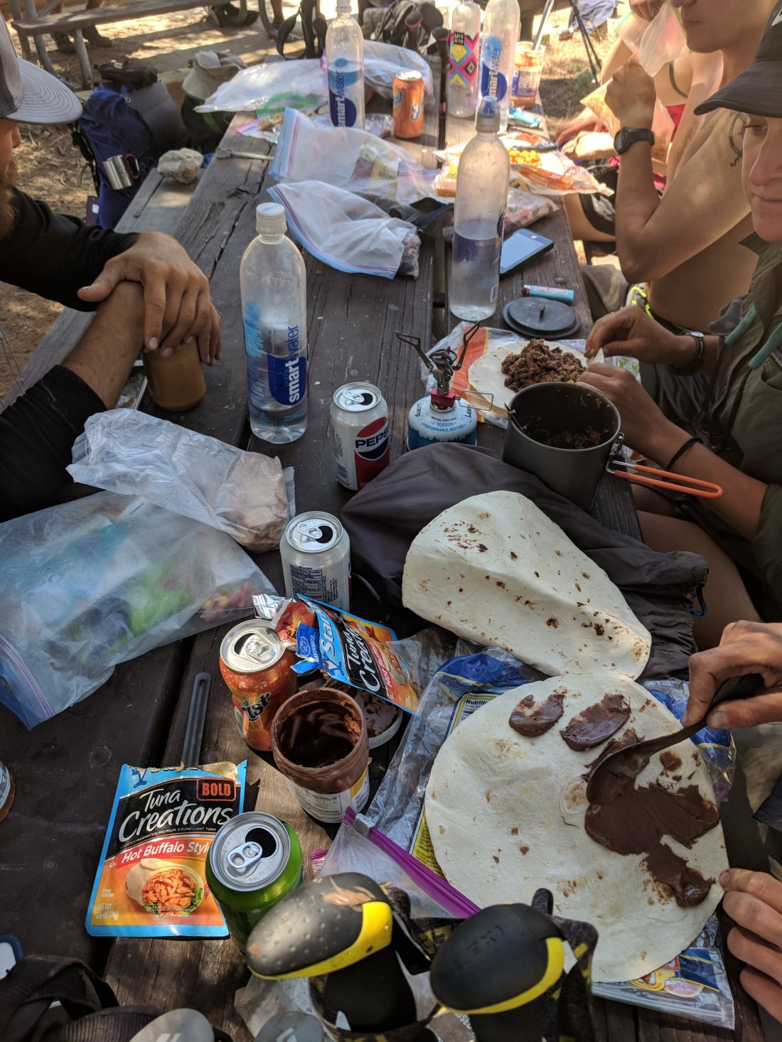 This is what lunchtime looks like at the North Fork Ranger Station mile 436.1. This ranger station had pop on ice and bottled water due to another long waterless area.