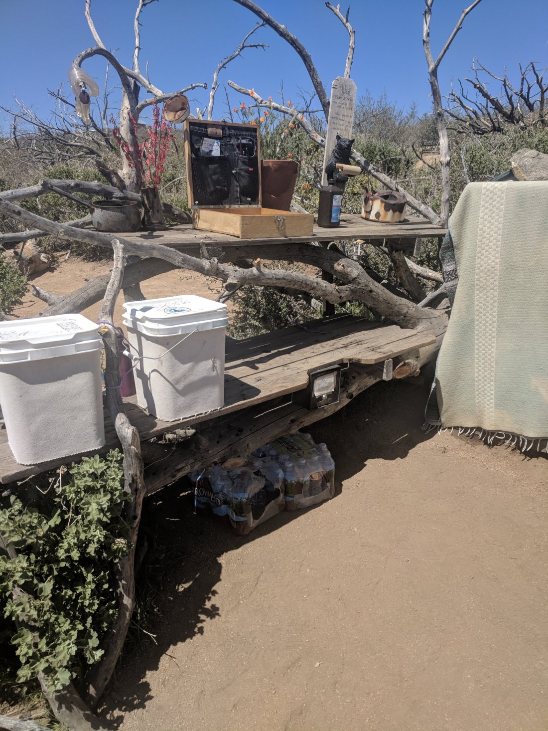 Below is a random trail magic area with a sunshade, chairs and water cache.