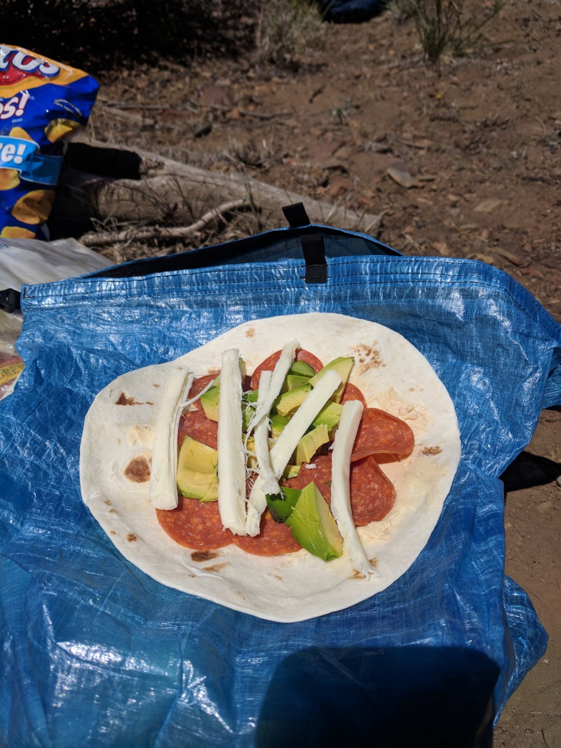 For lunch, Tortilla, avocado, string cheese and pepperoni.