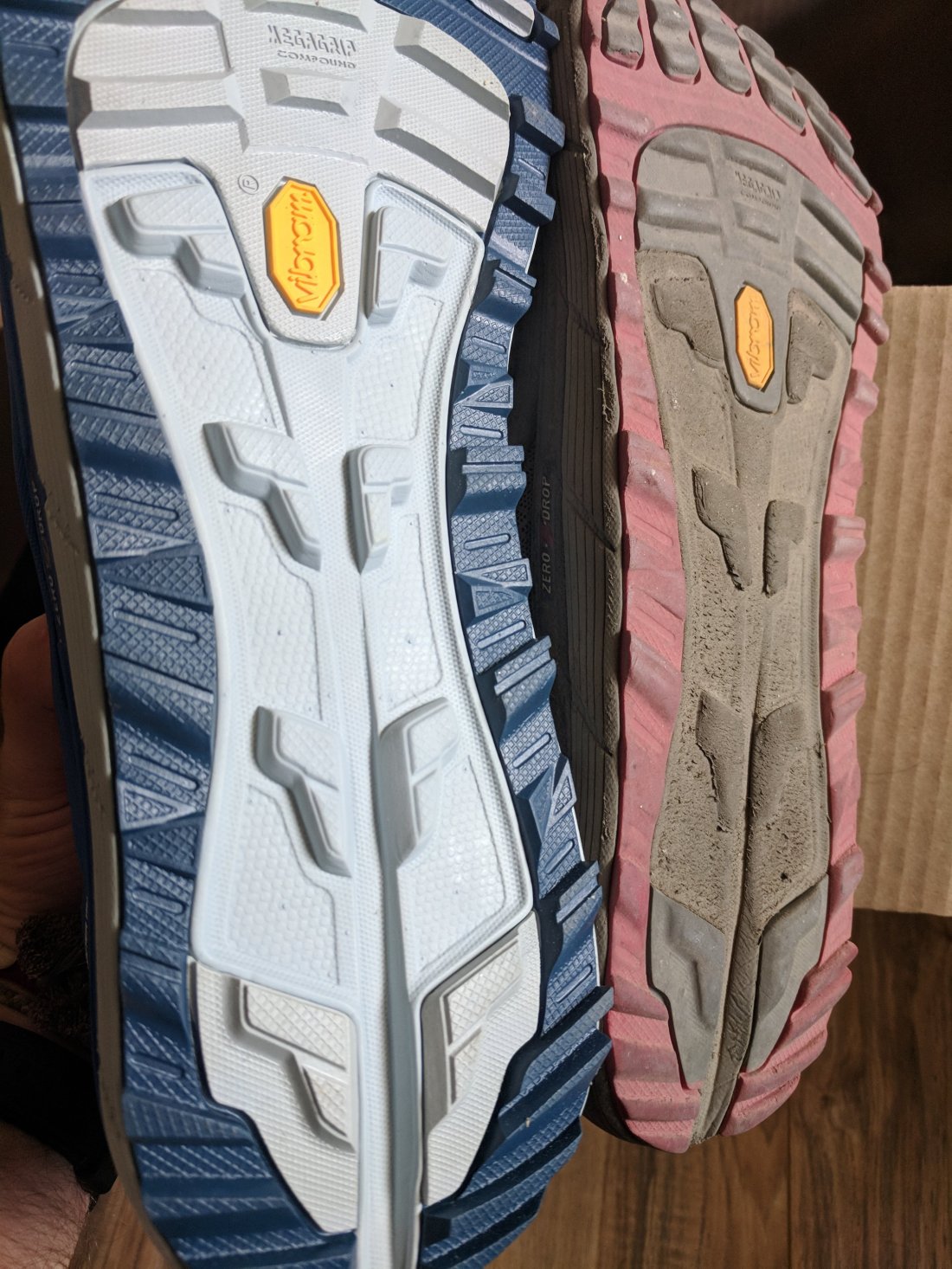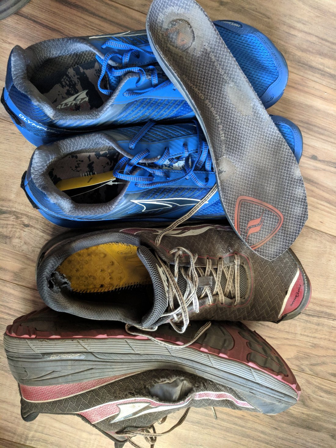 New shoe day!!!!! This is what 650 miles does to trail runners. Note that I should have replaced these 200 miles ago. The sides were ripped out with ductape inside to try and keep rocks out. The inner heels have worn away all the fabric! How is it that my socks didn’t wear out?! No wonder my feet were killing me at 15 Miles into the day.