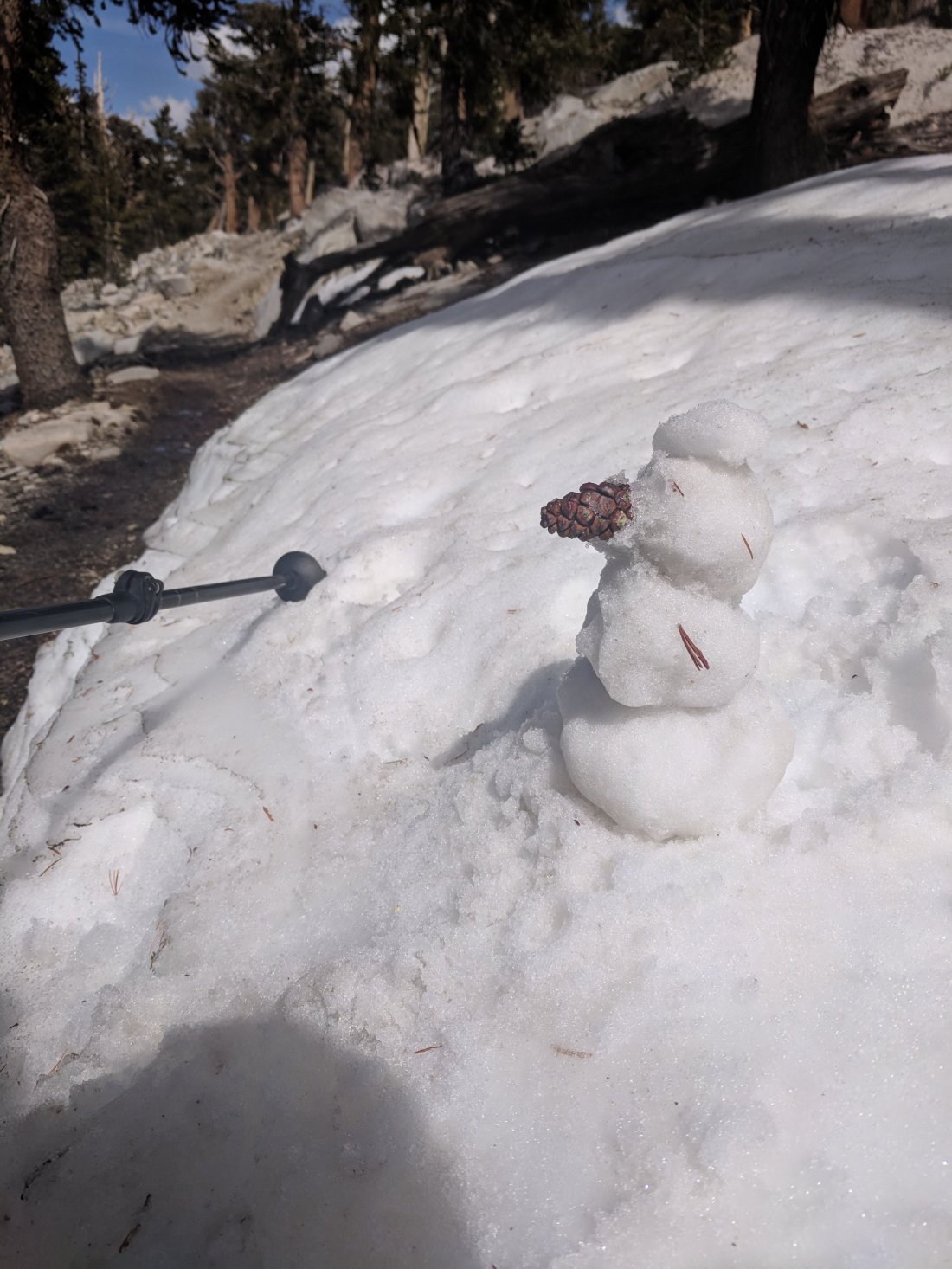 After making it back up the 2 mile side trail (Trail Pass) to the PCT I happened to meet Paparazzi, Dutchie and Verde who had been at Kennedy Meadows a few days before. Snow in shady areas are getting bigger now and begs for some creativity. Paparazzi made this snow man 👍.