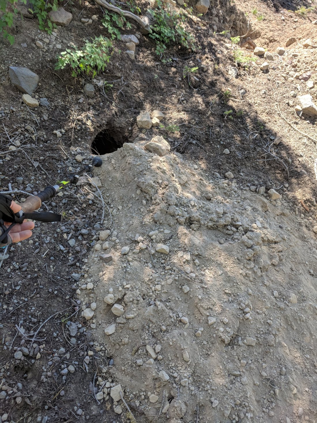 I assume this is a fresh badger den? 8″ diameter hole, dirt spilling over the trail. Crazy how this hole can be dug so cleanly. It looks like an auger did it.