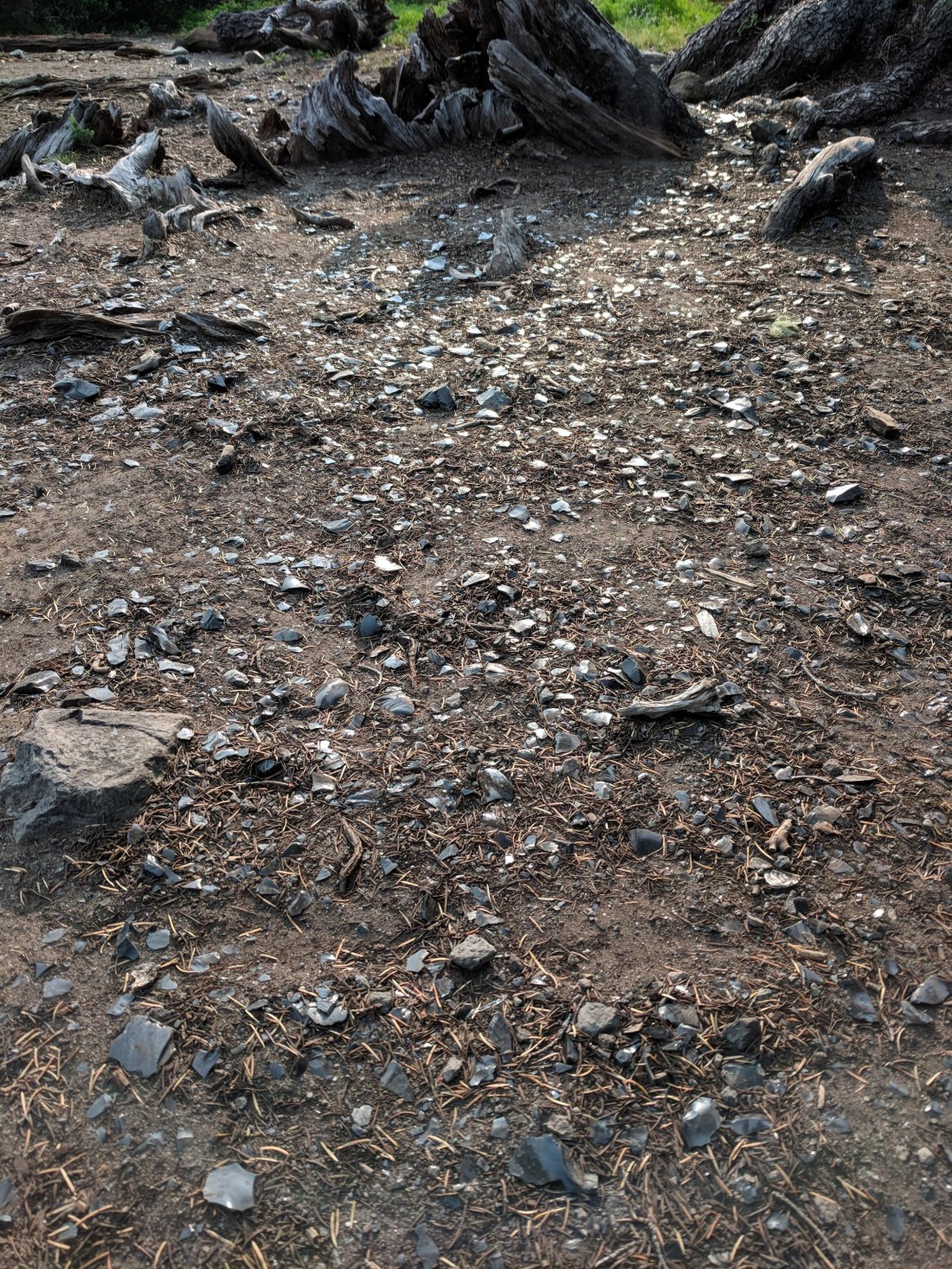 Obsidian shimmering all over the ground. Below is a piece of Obsidian, some were soccer ball size. Obsidian is volcanic glass used by Native Americans to made tools.