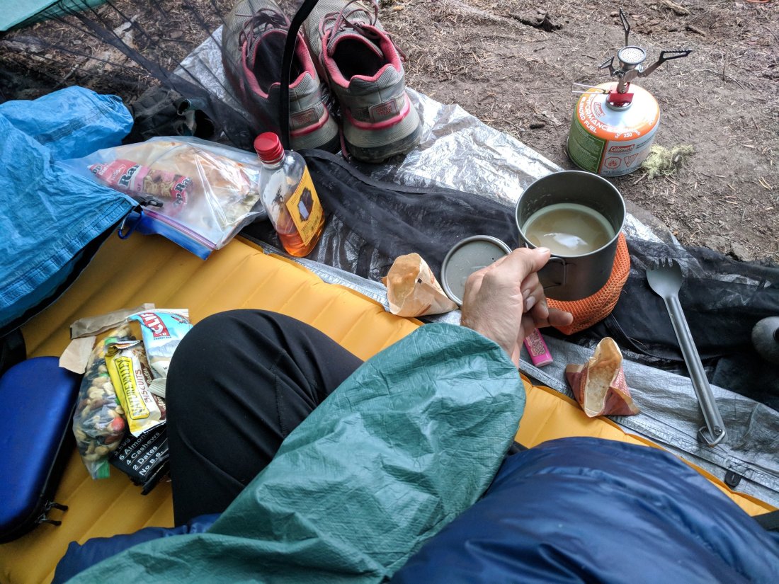 When we got into camp last night I could see my breath! This morning is chilly and overcast again, it’s looking like rain today so I’m taking my time getting packed up. Two oatmeal packets soaking and a cup of coffee while I look out at fog laced trees. Once I was back on trail I soon realized what I thought was fog is really smoke. Likewise, the plants were dry this morning along the trail so there was no condensation last night. i do recall waking up last night to the smell of smoke. Below: Ziploc bag for trash and snacks ready to be put in my hip belt pockets.