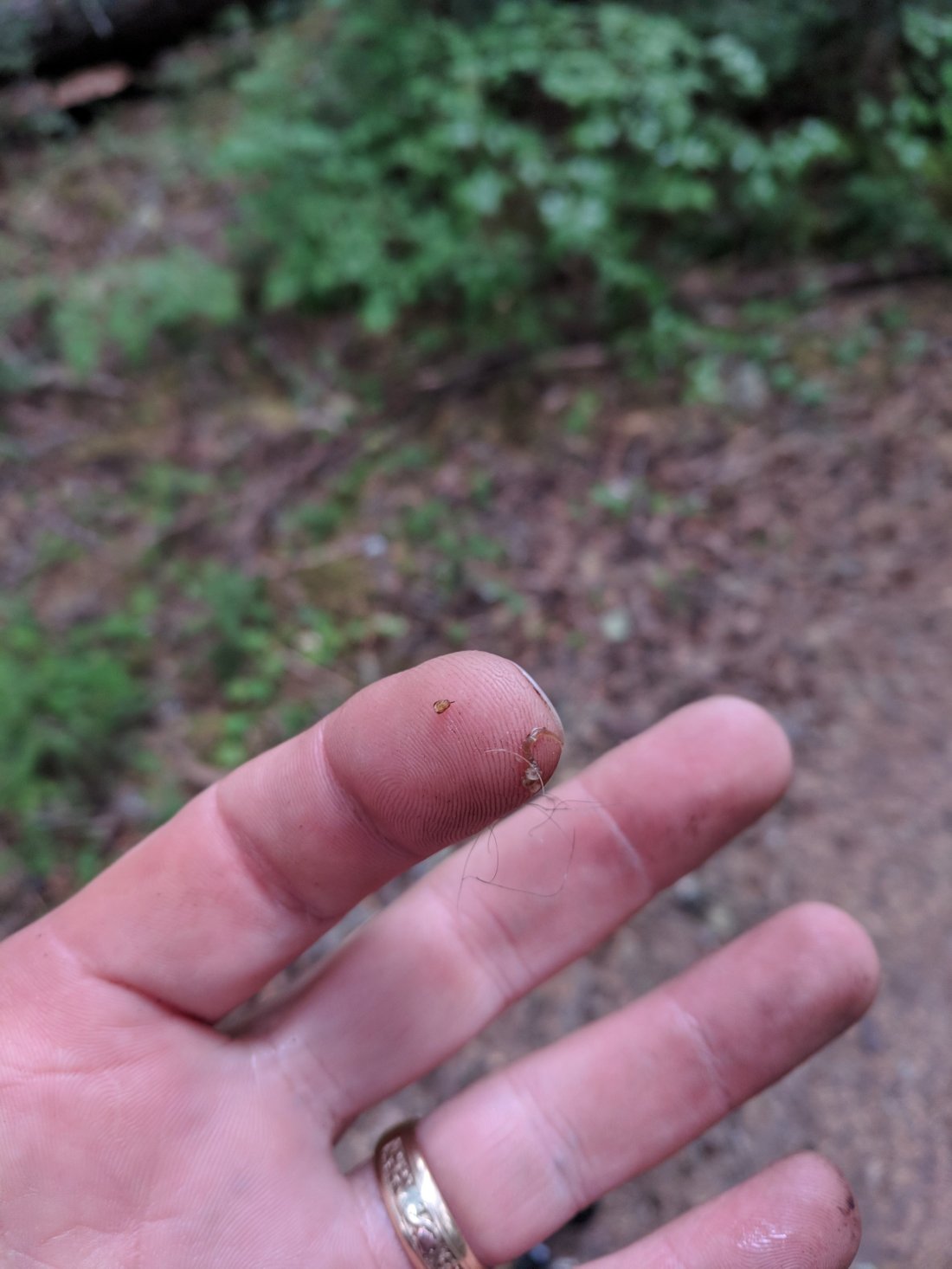 Below: I don’t understand what the attraction is to my calves! Another sting and while it was raining. This time it’s confirmed as a bee or wasp because it left the stinger and venom sack stabbed into me. I recall reading that the venom sack will continue convulsing even after leaving the bees body so I tried removing it without squeezing more venom, took a few leg hairs too. This one definitely hurt but not much else to be done so keep on truckin!